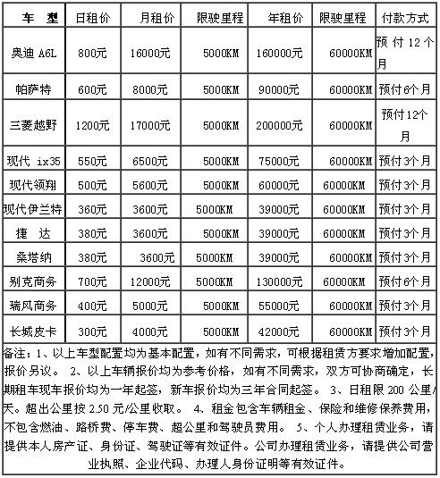 泰安首汽租賃公司租賃車(chē)輛報價(jià)表